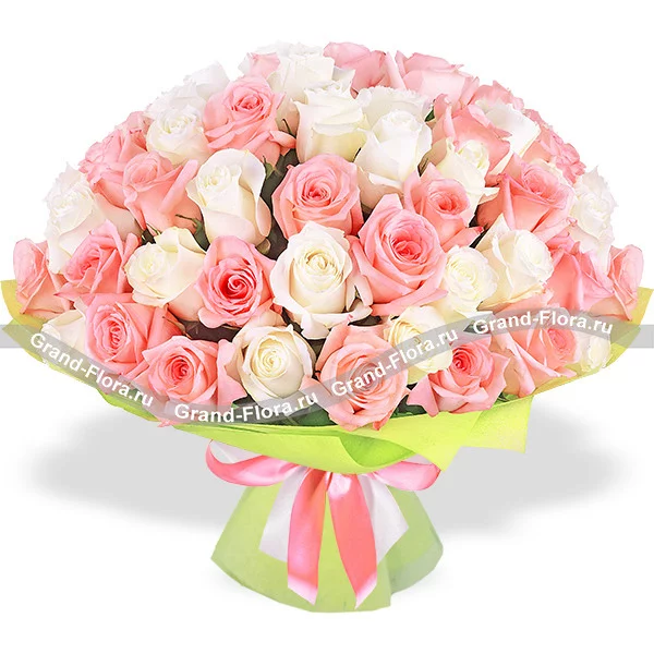 Букет белых роз и розовых роз (акционный букет, высота роз 40-50 см) Роза белая, роза розовая - 101 шт., упаковка, лента.